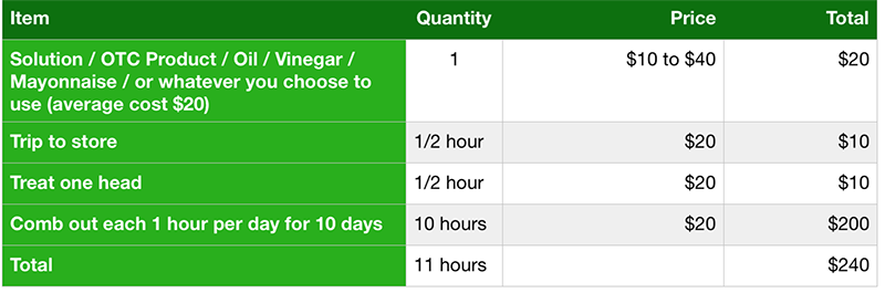 We know each family and situation is different, so this is just one scenario, but if you have 3 people in the family with bugs and nits, how much money did you actually save by doing it yourself. This same 11 hours over a 10 day period is only for one person, so now multiply by three. What did you give up that you could have done instead? Were you successful? Do you guarantee your own work? And oh yes, our sample family drove for four hours, most of our families are within one hour of our clinics.